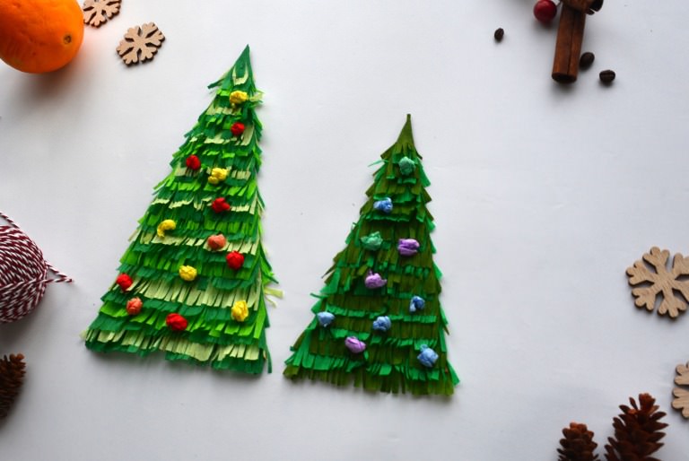 Wiemy, że nie możecie się już doczekać ubierania choinki – my też! 😀 Dlatego mamy dziś dla Was propozycję pracy plastycznej – stwórzcie i przyozdóbcie swoje choinki wykonane ze sztywnego kartonu i bibuły😀 Nożyczki i klej w dłoń i do dzieła😀