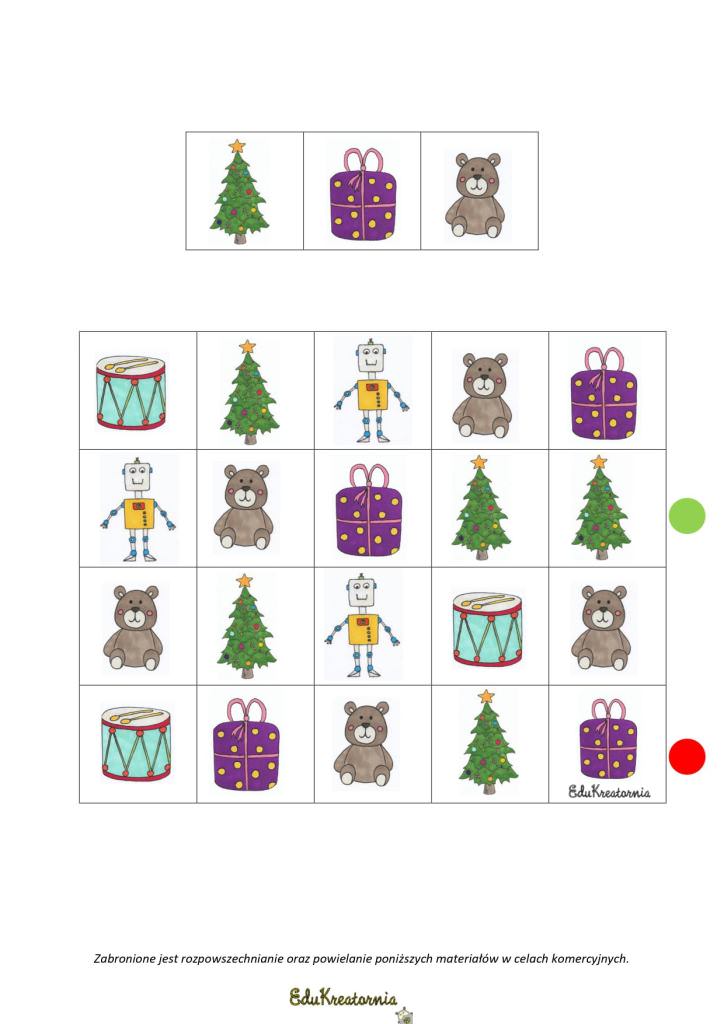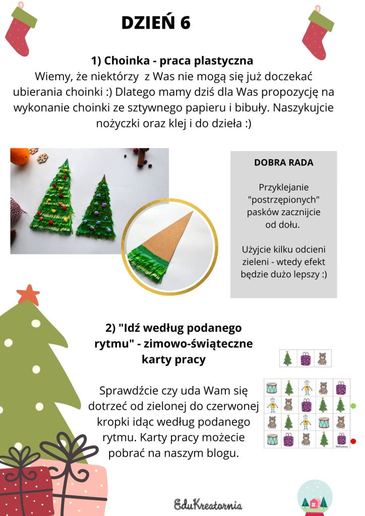 Zadanie dodatkowe to karty pracy „Idź według podanego rytmu” w wersji świąteczno-zimowej😀 Czy uda Wam się dotrzeć od zielonej do czerwonej kropki podążając za podanym rytmem?😀